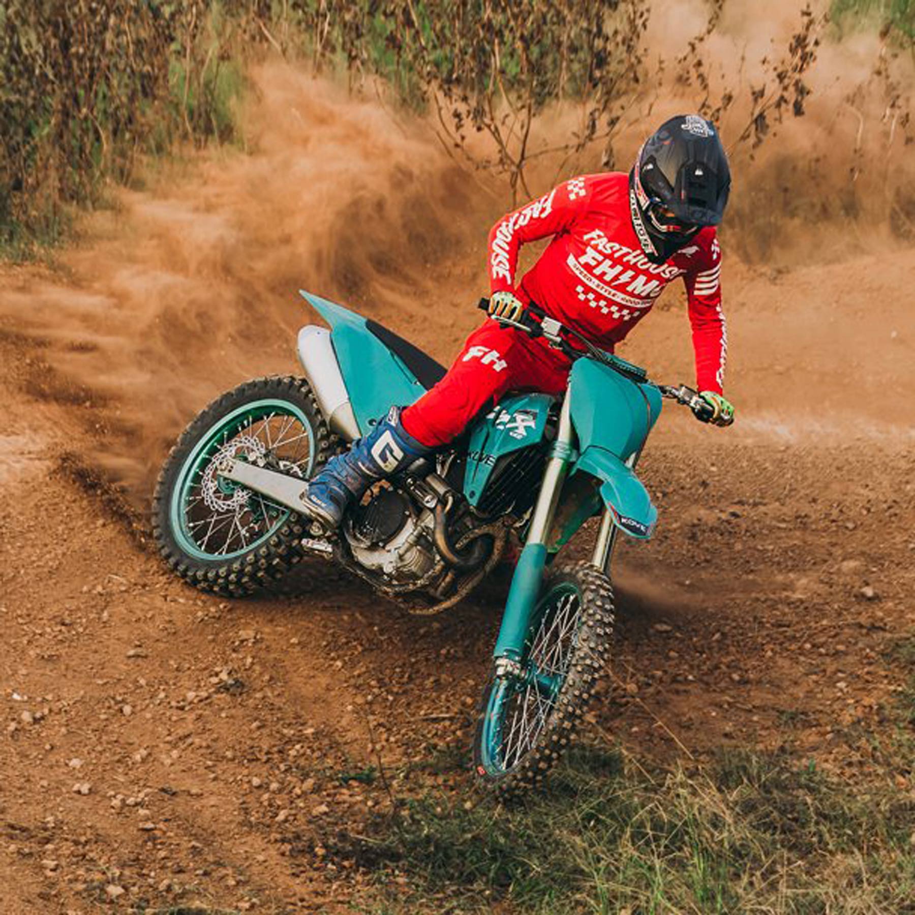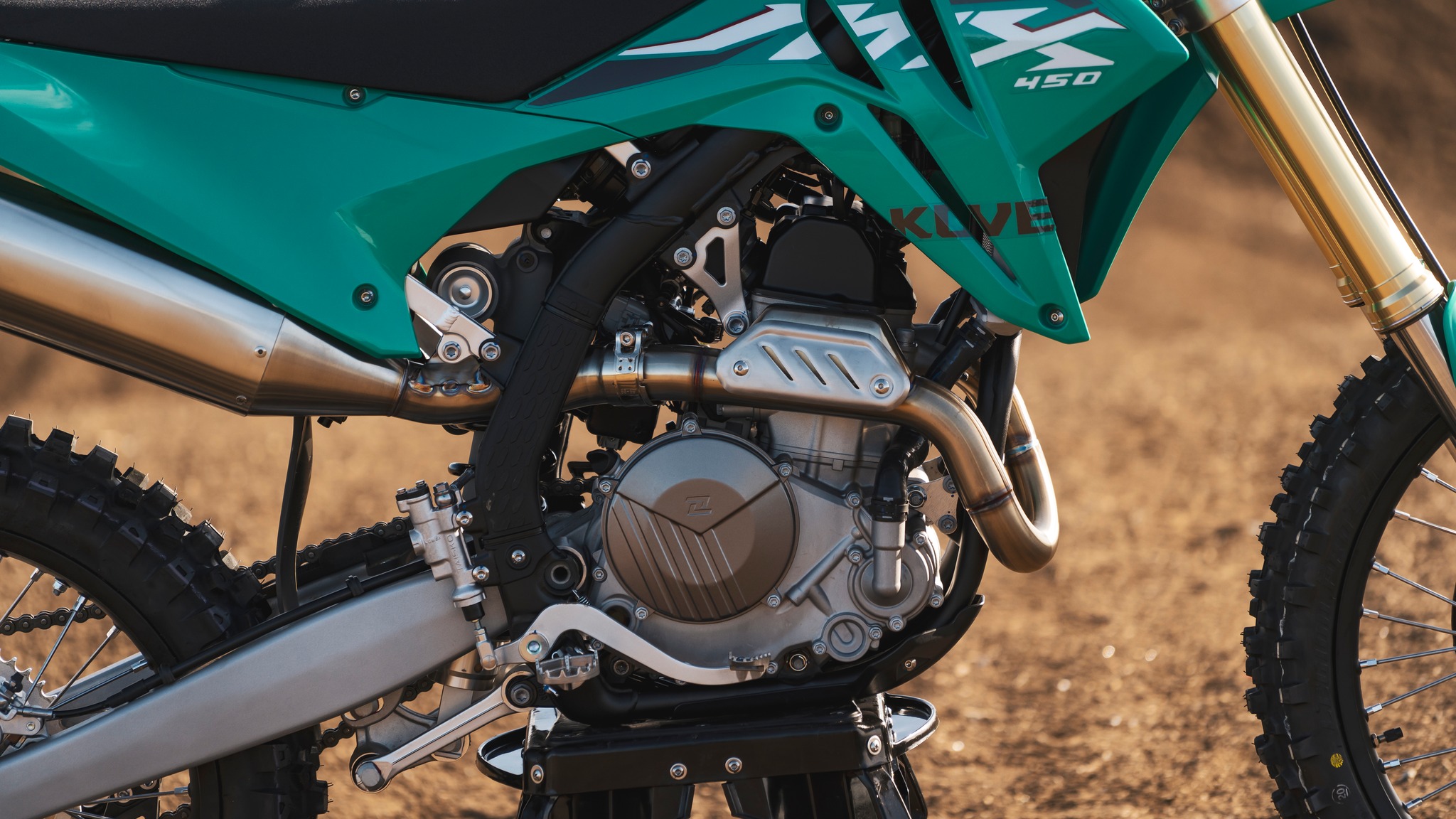 Die Bremskraft kommt von einer schwimmend gelagerten Vorderradbremsscheibe mit 2-Kolben-Bremssattel und einer Hinterradbremsscheibe mit 1-Kolben-Bremssattel, die für sanftes, kontrollierbares Bremsen sorgt. Montiert auf einem 90/90-21-Vorderreifen und einem 110/90-19-Hinterreifen, sorgen der 38,5°-Lenkwinkel und der 28°-Vorlauf des MX450 für messerscharfes Handling und sofortiges Einlenken auf engen Trails und bei rasanten Fahrten gleichermaßen.